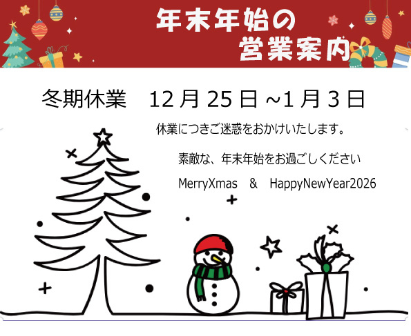 12月25日より1月3日まで休業いたします。皆様が素敵な年末年始をお過ごしになられますようお祈り申し上げます。