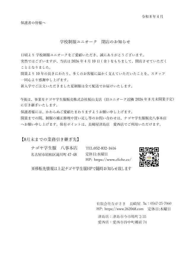 ユニオーク 長崎屋瑞穂店閉店のお知らせ