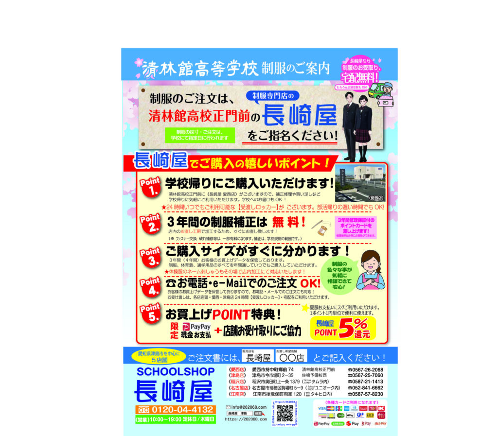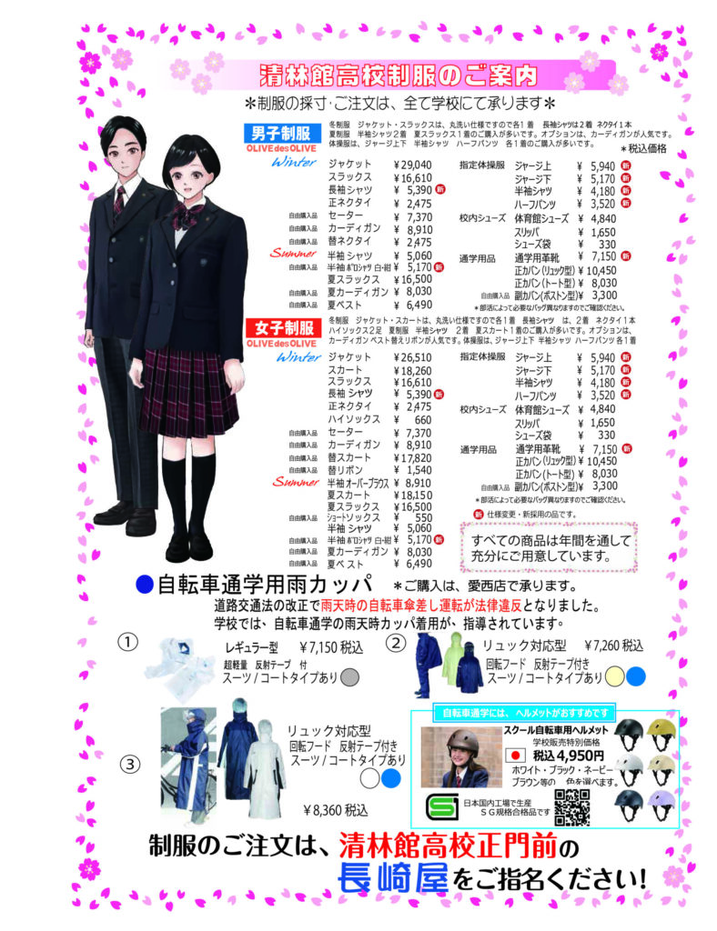 清林館高校の新入学採寸は全て学校指定日に学校でおこないます。